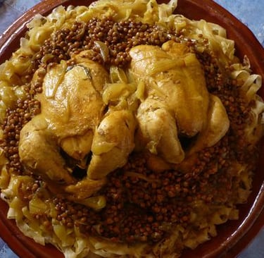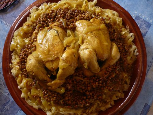 La rfissa est préparation au poulet sur un lit de galette (msemen) découpés.